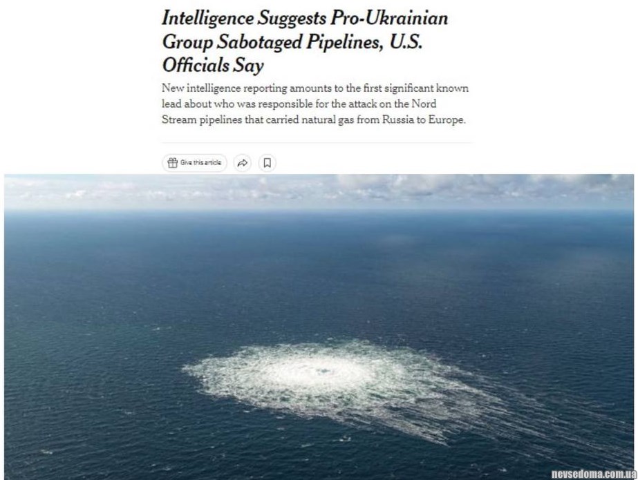 According to the publication (https://www.nytimes.com/2023/03/07/us/politics/nord-stream-pipeline-sabotage-ukraine.html), this is indicated by "new intelligence data, with which U.S. officials have been informed. Officials believe that Ukraine and its allies have the most logical potential motive for attacking the pipelines.