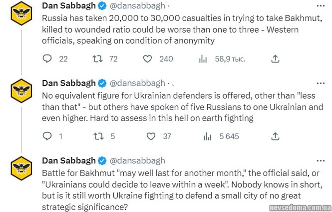 - The RF Armed Forces lost from 20,000 to 30,000 manpower in the battles near Bakhmut, — writes (https://twitter.com/dansabbagh/status/1633098132325015554) The Guardian journalist Dan Sabagg, citing Western officers.