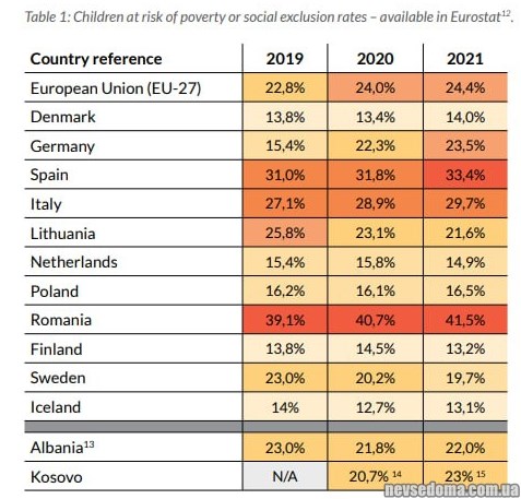 The worst performers (https://www.dw.com/en/1-in-4-children-at-risk-of-poverty-in-europe-report-says/a-64904952) are now in Spain and Romania: 33.4% and 41.5% of children, respectively. The risk of poverty for children was lowest in Finland (13.2%) and Iceland (13.1%).