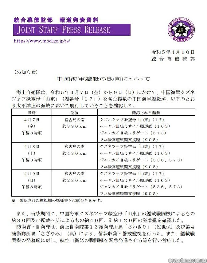 - The Ministry of Defense of Japan is tracking the Chinese aircraft carrier Shandong, which is conducting exercises against Taiwan.