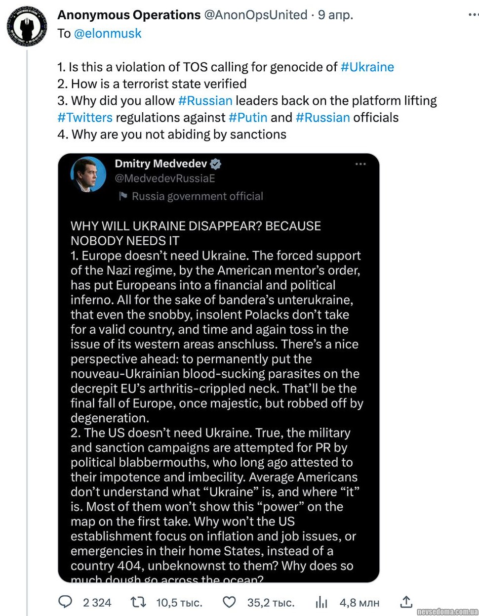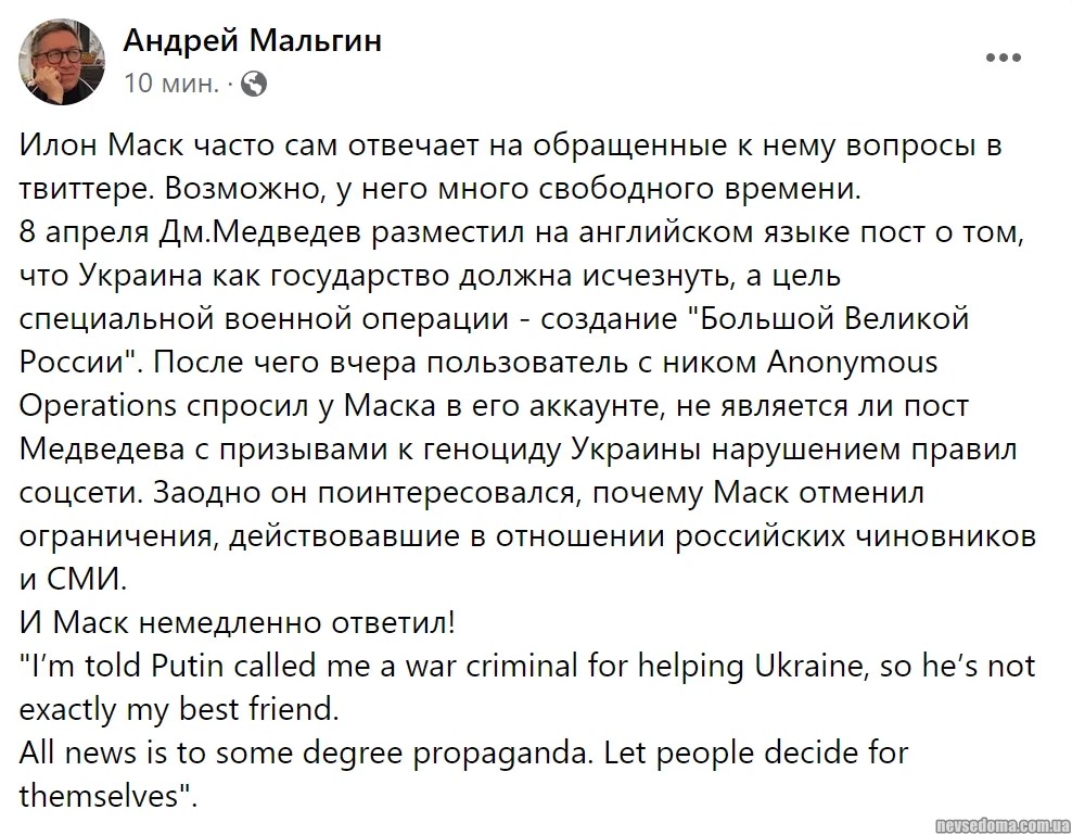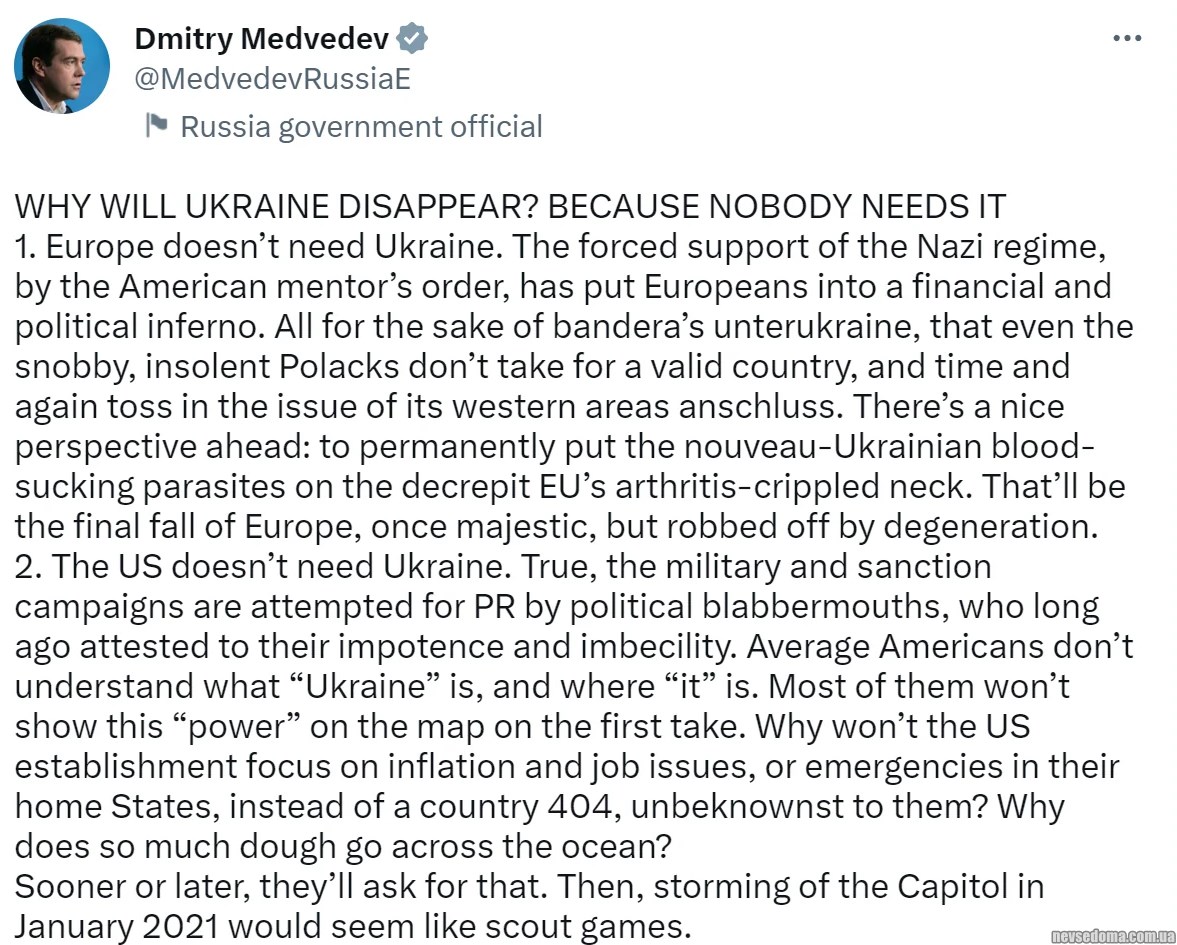 - Elon Musk refused to delete Dmitry Medvedev's tweet that "Ukraine will disappear" hellip; because no one needs it.