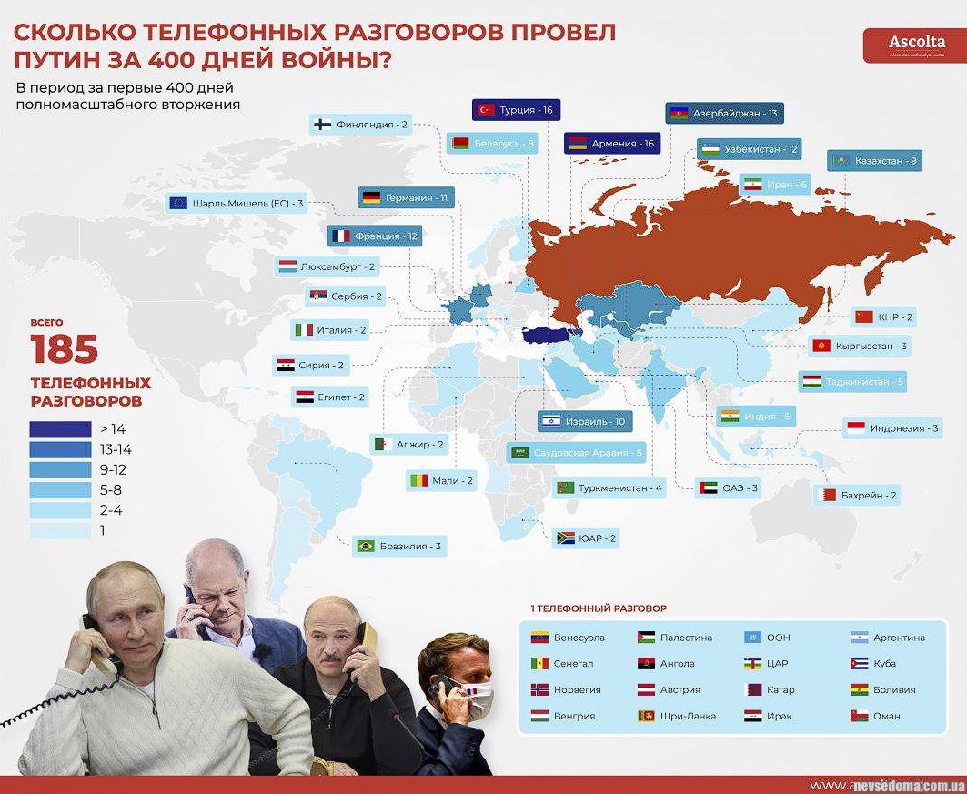 From February 24, 2022 to March 30, 2023, Putin held (https://www.ascolta.org/?p=3008&lang=ru) 183 official telephone conversations with leaders of other states. Most often, Putin spoke with the leaders of Turkey, Armenia, France and Germany - more than 10 times.