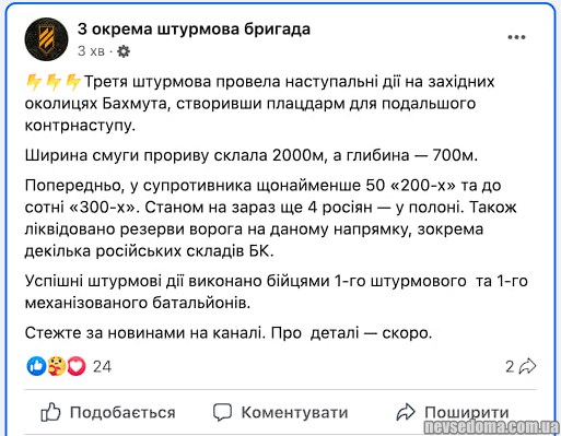 - A bridgehead has been created for further offensive: the 3rd Assault Brigade carried out an offensive on the flanks of Bakhmut.