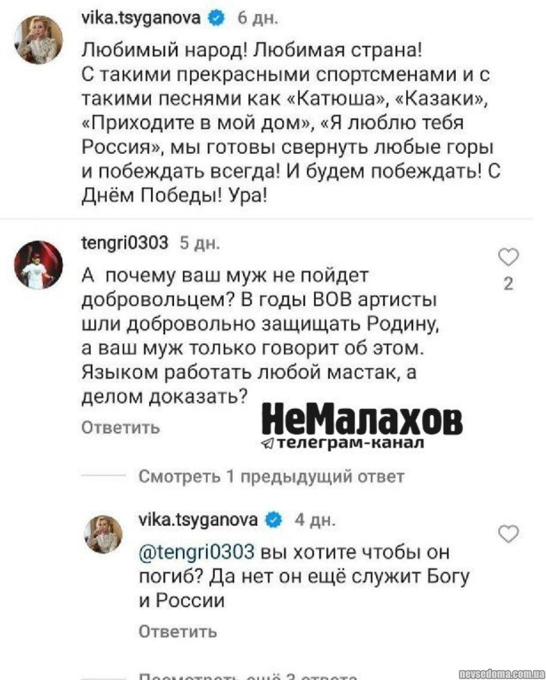 - Rashist singer Vika Tsyganova is sincerely outraged by the question why her husband is not at war: "Do you want him to die ?!"