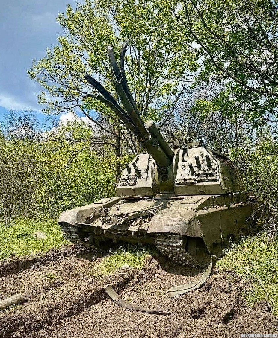 - The torn barrel of the Russian 152-mm self-propelled howitzer 2S19 Msta-S