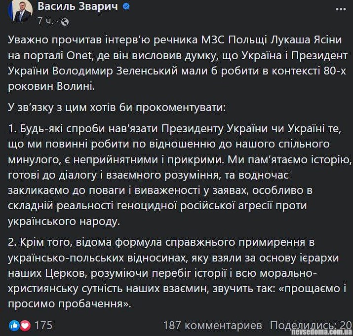 This is how Ukrainian Ambassador to Poland Vasily Zvarych commented on the advice of the Polish Foreign Ministry on how Zelensky should "apologize for Volyn".