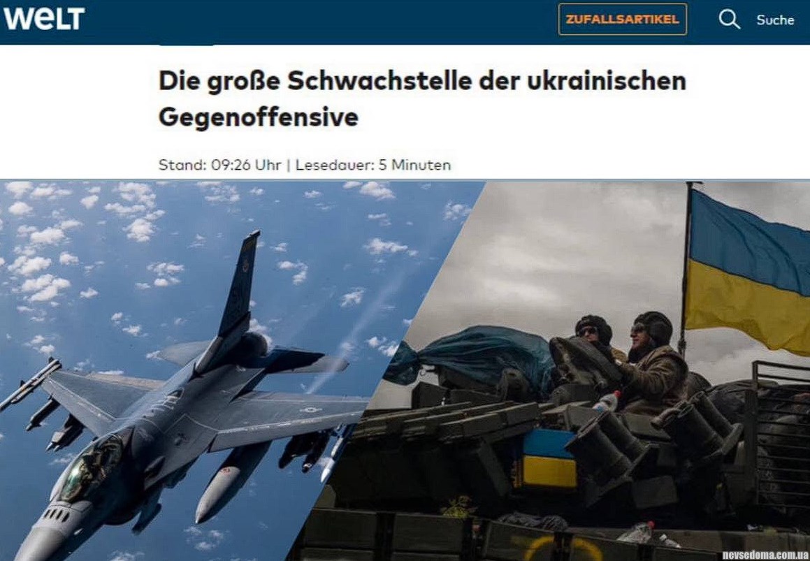At present, the Russian Federation surpasses Ukraine in the number of aircraft by 5-6 times, they also surpass in technologies — their radar sees farther, and missiles have a much longer range. The fighters were late for the summer offensive, so the battle in the sky — weakness. The publication writes (https://www.welt.de/politik/ausland/plus245598182/Militaerstrategie-Die-grosse-Schwachstelle-der-ukrainischen-Gegenoffensive.html) that because of this, Ukraine will have to de-occupy territories with the help of artillery, heavy weapons and the blood of our soldiers.