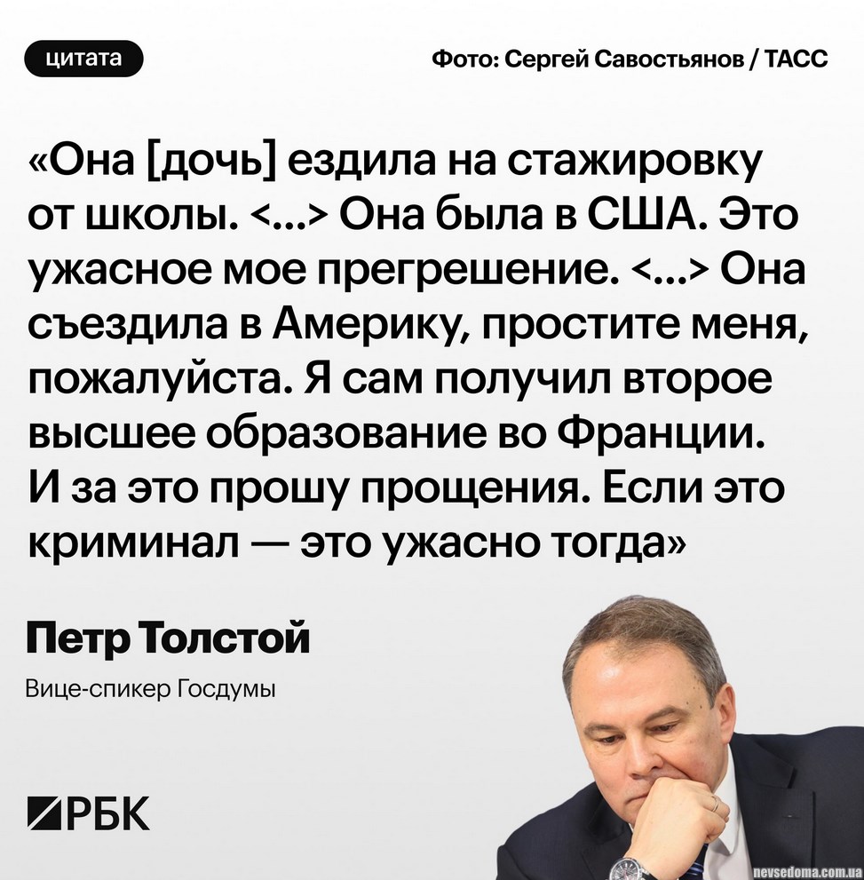 - Vice-Speaker of the State Duma, United Russia party Pyotr Tolstoy apologized for his daughter's trip to the United States for an internship, as well as for the fact that he himself studied abroad.