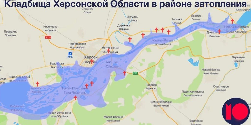 - Flooded cemeteries After the dam burst, the deputy head of the administration of Novaya Kakhovka reported about the flooding of the local cemetery. In addition, at least four more cemeteries downstream were in the flood zone (see map). Locals confirm that there were fresh graves there.