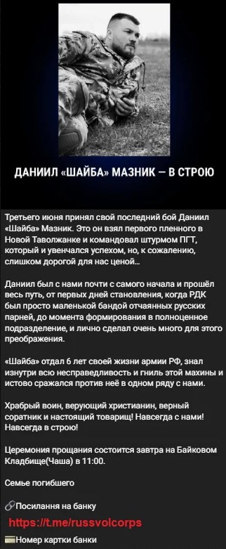 - RDK fighter Daniil "Puck" Maznik died heroically fighting the Russian Federation on June 3 in Novaya Tavolzhanka. You could see him behind an armored personnel carrier stolen from the Russian Federation. Previously, he served in the Russian army for several years. Probably came from the Rostov region