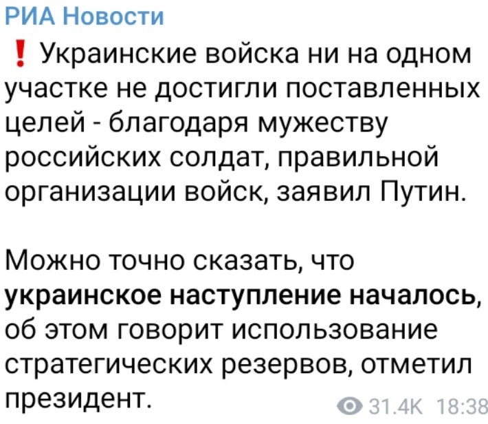 Ukrainian military in an interview (https://www.washingtonpost.com/world/2023/06/08/russia-ukraine-war-news-counteroffensive/) said that our soldiers really launched a counteroffensive in the Zaporozhye region, but it is very difficult, there are "continuous difficult battles."