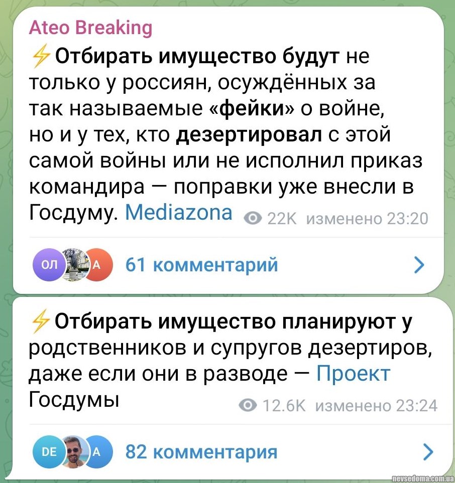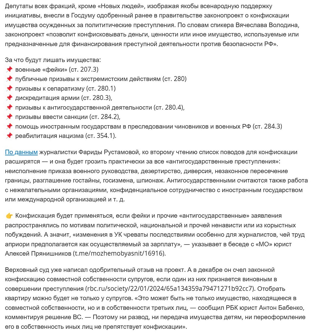 - The State Duma adopted in the first reading a bill on confiscation of property and deprivation of honorary titles for crimes against the regime, including the truth about the war and desertion