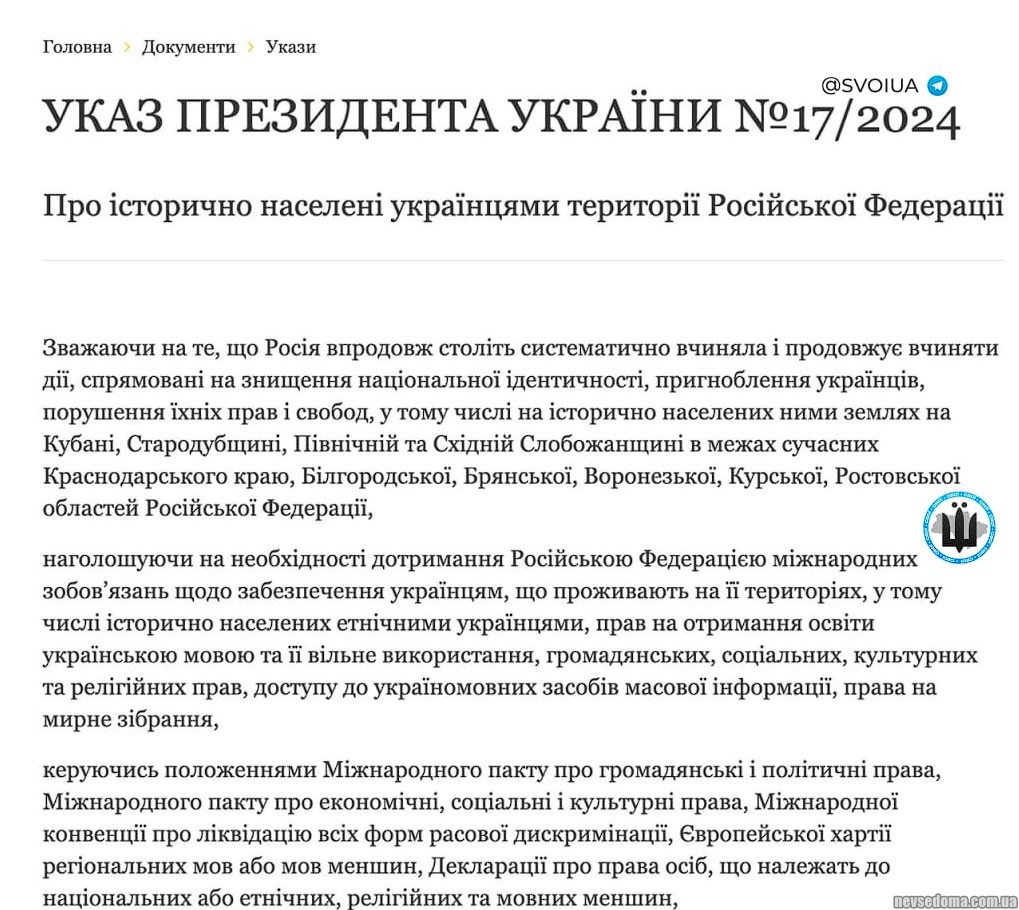 Zelensky’s decree regarding the territories of the Russian Federation historically populated by Ukrainians appeared on the website of the Office of the President