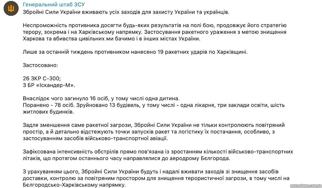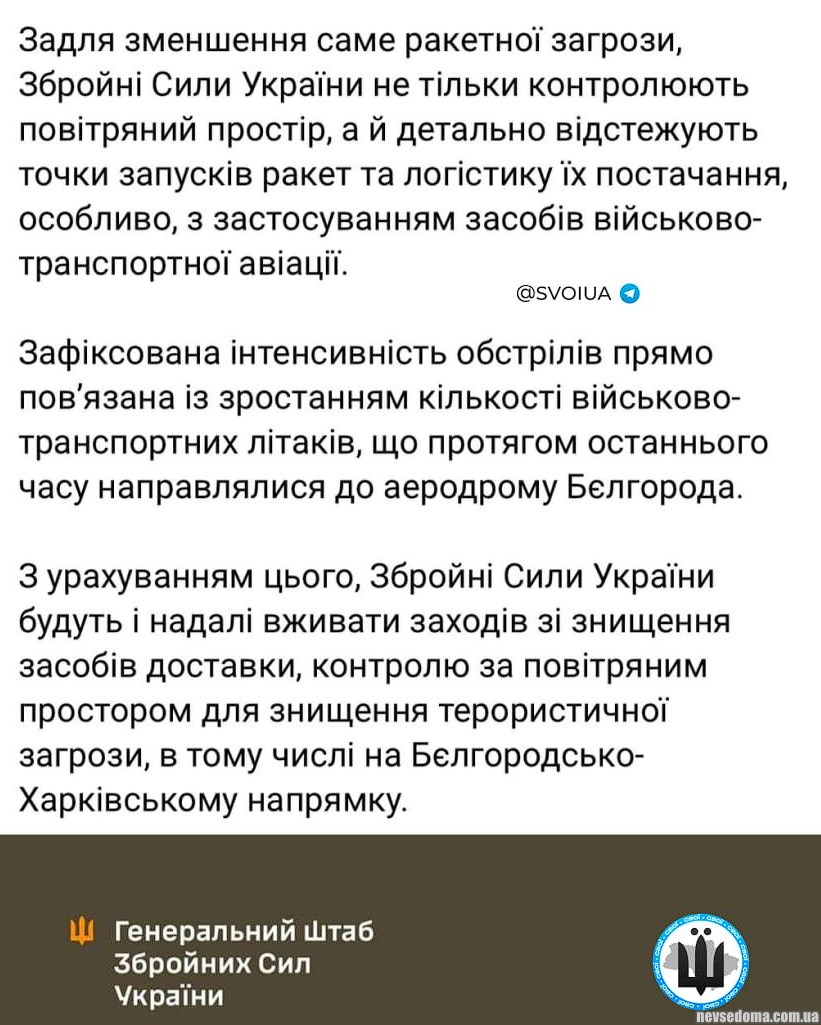 The Armed Forces of Ukraine will continue to take measures to destroy delivery vehicles and control airspace to destroy the terrorist threat, including in the Belgorod-Kharkov direction, - General Staff about the downed Il-76.