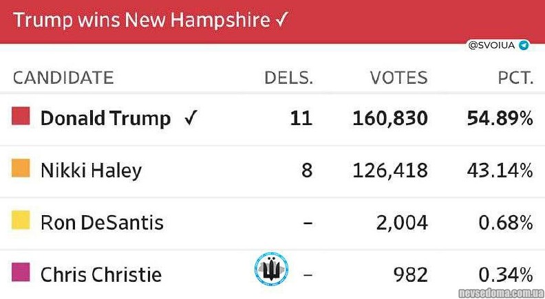 Trump received 54% of the vote, while his main rival Nikki Haley received 44.5%. Haley expressed her intention to continue fighting in the presidential race.