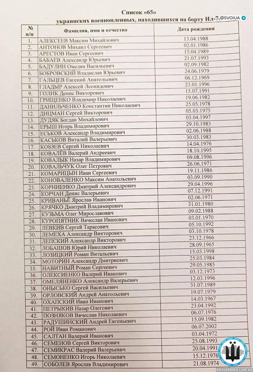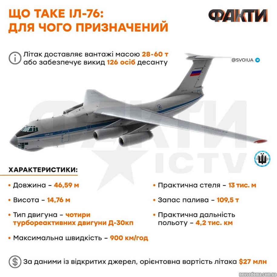 The Russian Ministry of Defense reported that on board the fallen Il-76 there were 65 captured military personnel of the Ukrainian Armed Forces transported to the Belgorod region for exchange, 6 crew members and 3 accompanying persons.