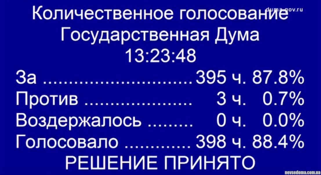 The authors of the corresponding initiative were 395 deputies of parliament, led by Chairman Vyacheslav Volodin. Three spoke out against it; it was not specified who it was.