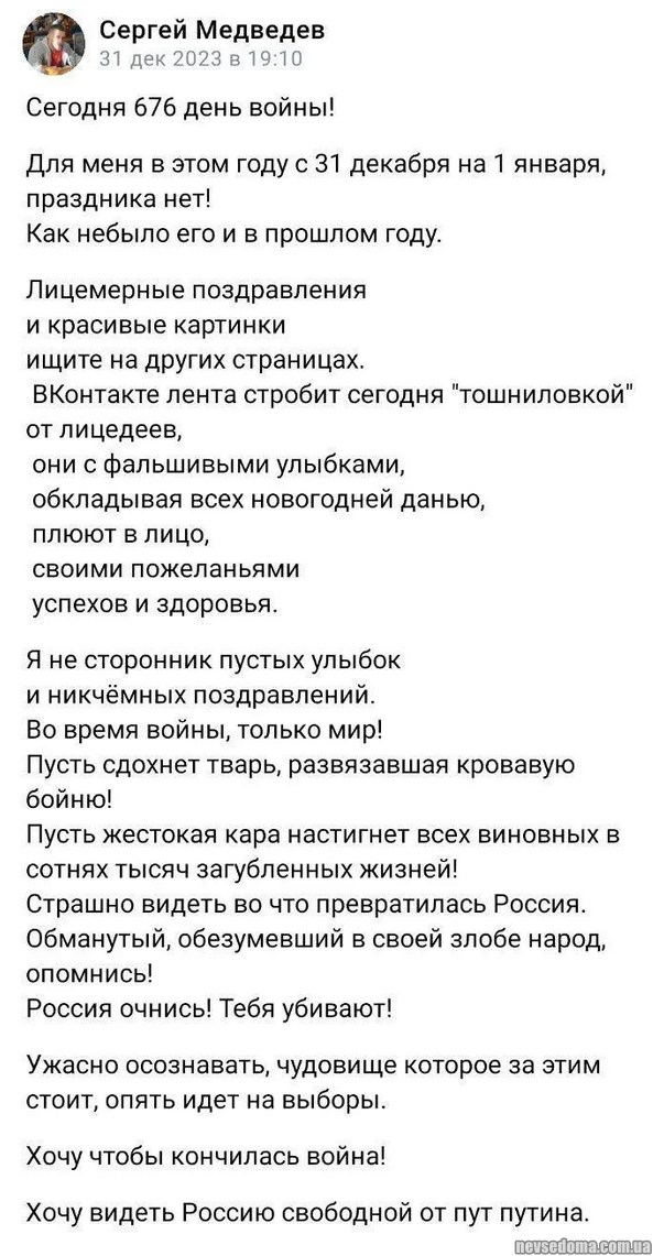 The persecution of Sergei Medvedev began after he posted a post on December 31, where he stated that he would not celebrate the New Year because of the war in Ukraine, and called for “an end to the SVO.” “Let the creature who started the bloody war die,” quotes (t.me/astrapress/45917) the ASTRA deputy. On January 14, Medvedev was expelled from the Communist Party of the Russian Federation, and the very next day he was put on the international wanted list.