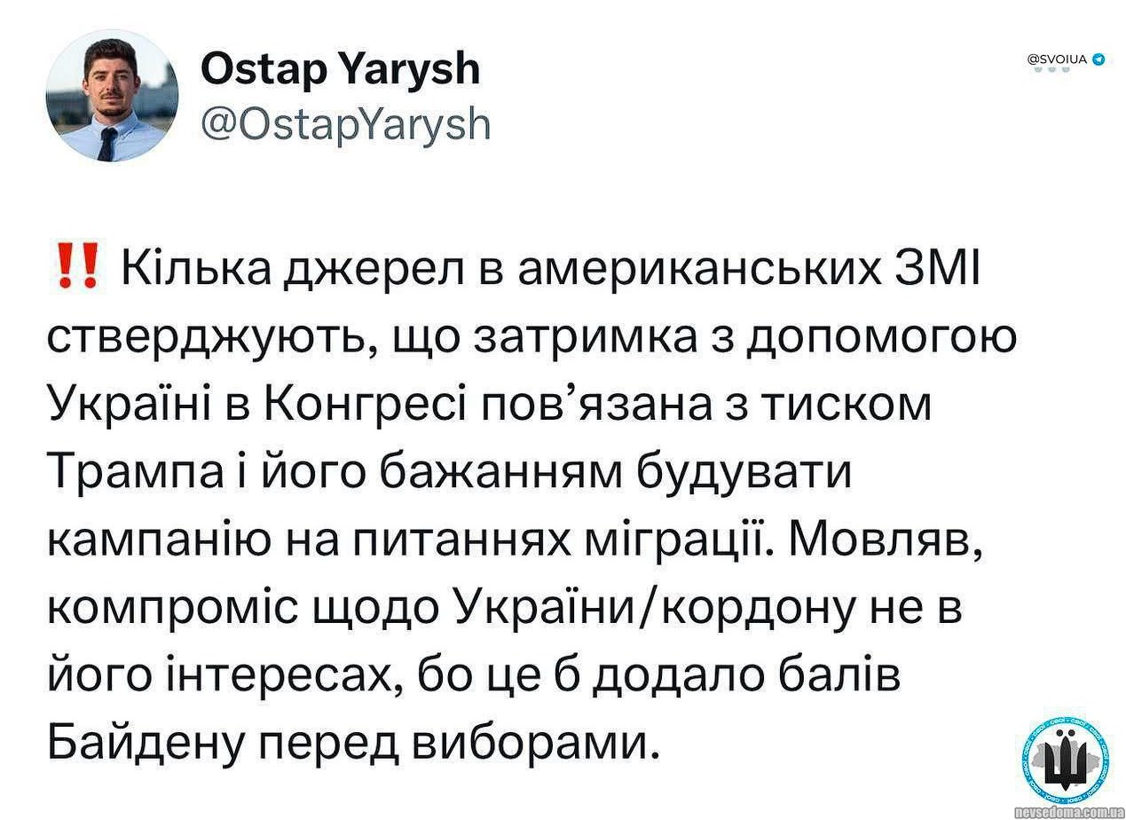 - The delay in helping Ukraine in Congress is due to pressure from Trump, reports Voice of America correspondent Ostap Yarish.