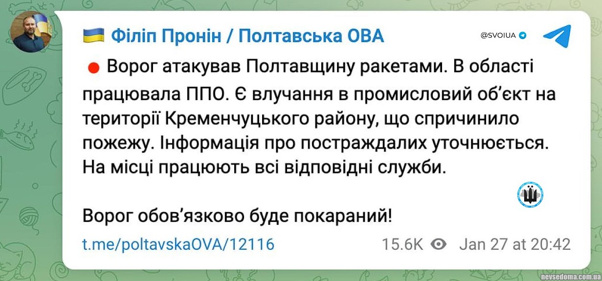 - Explosions were heard in Poltava, an industrial facility in the Kremenchug region was hit, - Poltava OVA.