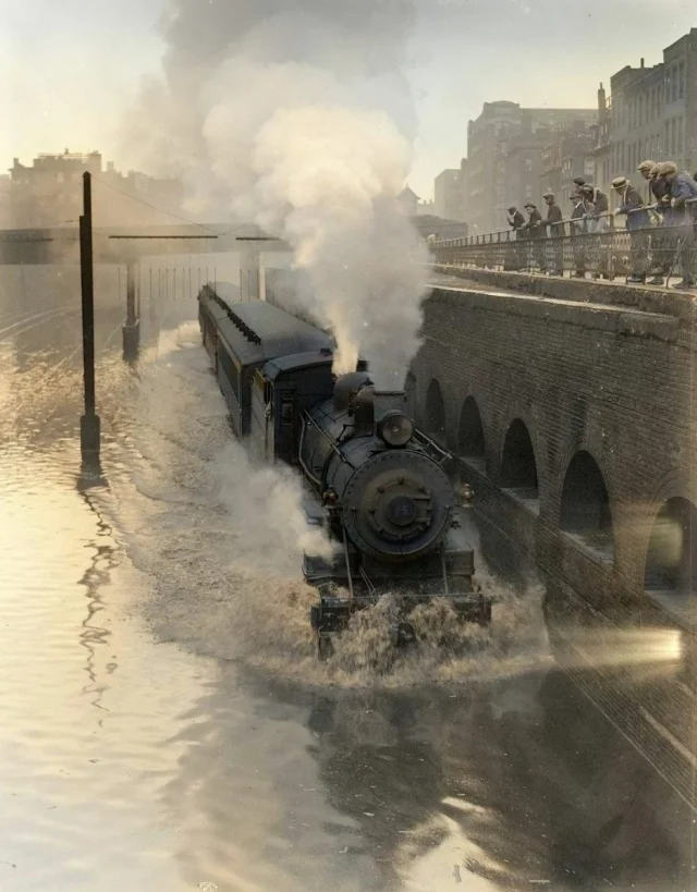 Паровоз рухається затопленою вулицею під час повені у Бостоні, 1915 рік.