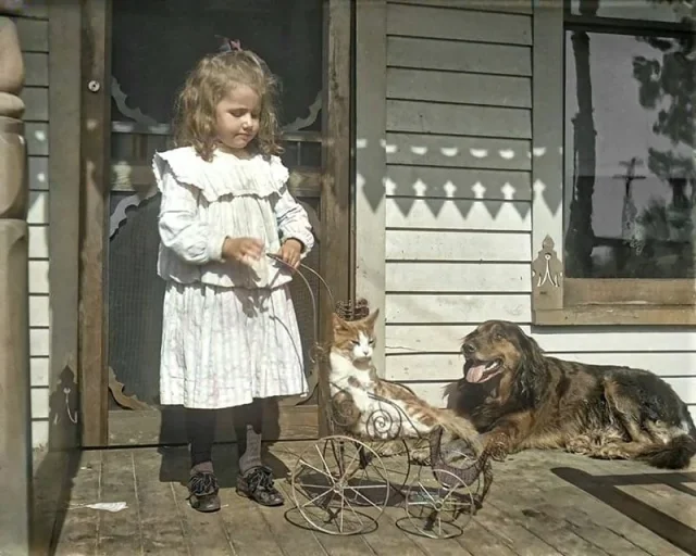 Дівчинка зі своїм домашнім котом у колясці та собачкою.