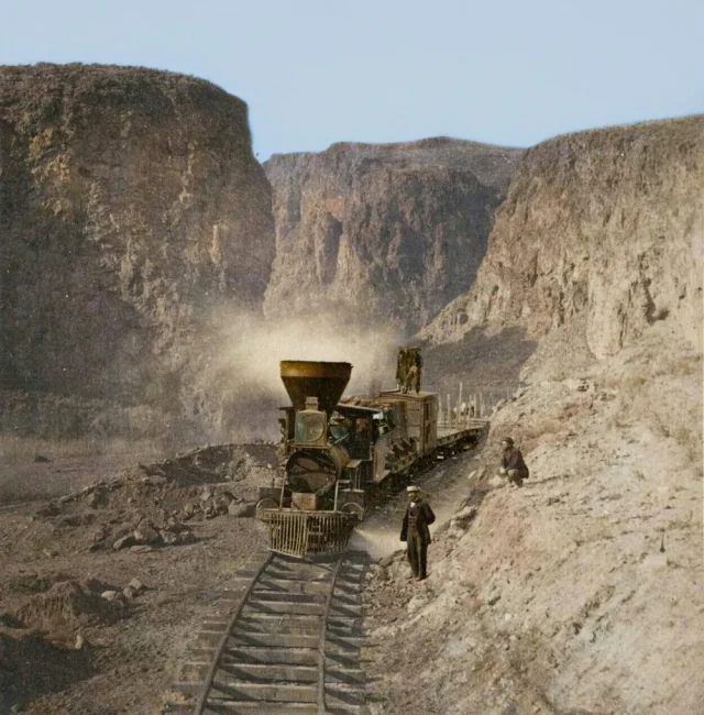 Перший будівельний поїзд проїжджає Палісейдс, Десятимільний каньйон, 1866-1869 рік.