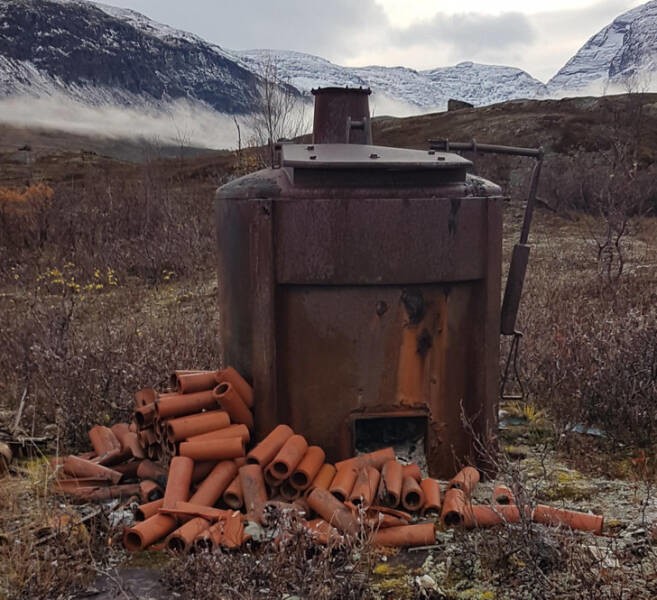 7. "Велика іржава стара піч, оточена глиняними трубками, знайдено в глушині Північної Швеції".