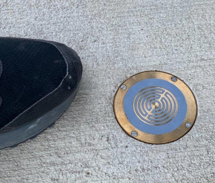 17. "Невелика накладка з металевим візерунком на троутарі, нога для масштабу"