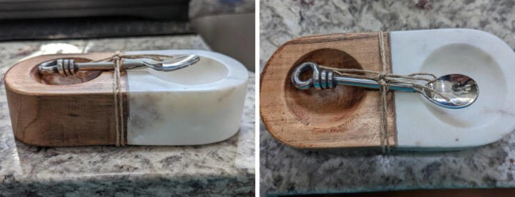 5. «Подарунок на новосілля. Наполовину з дерева, наполовину з мармуру, 2 напівкруглі заглиблення, маленька ложечка».