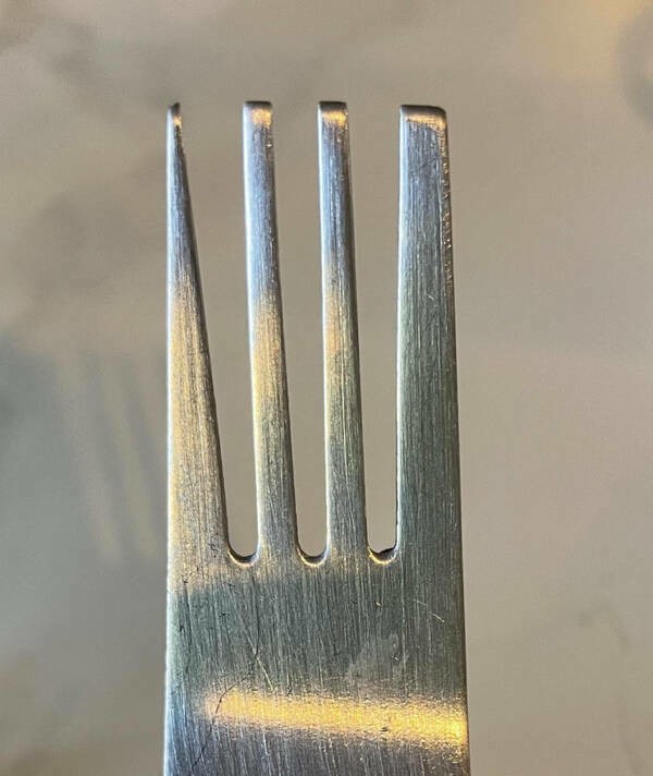 : «Схоже на збій у контролі якості Коли пуансон дійшов до прорізу, заготівля вилки вставилася не повністю. трохи скосилася. Якби контролер якості не відпочивав у цей момент, вона опинилася б у відрі для сміття».