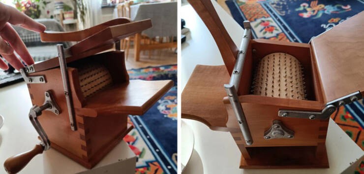 4. «Що це могло бути? Зроблено з дерева, усередині колесо з купою гострих шпильок. Здається, це щось на кшталт м'ясорубки, але для чого вона?