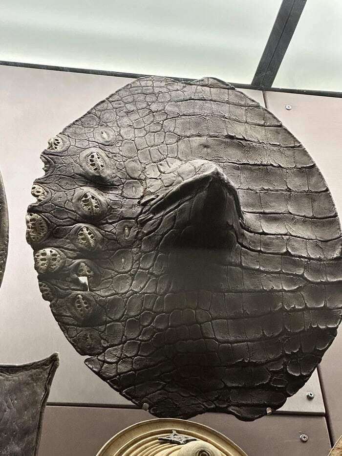 Це остеодерми — кісткові платівки, що знаходяться в шкірі деяких тварин. Швидше за все, цей щит зроблений зі шкіри крокодила.