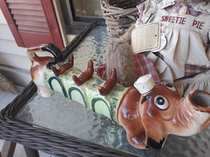 Це посудина для спиртних напоїв чи саке. Крихітні чашки або чарки, що звисають із шипів на її спині, відсутні.