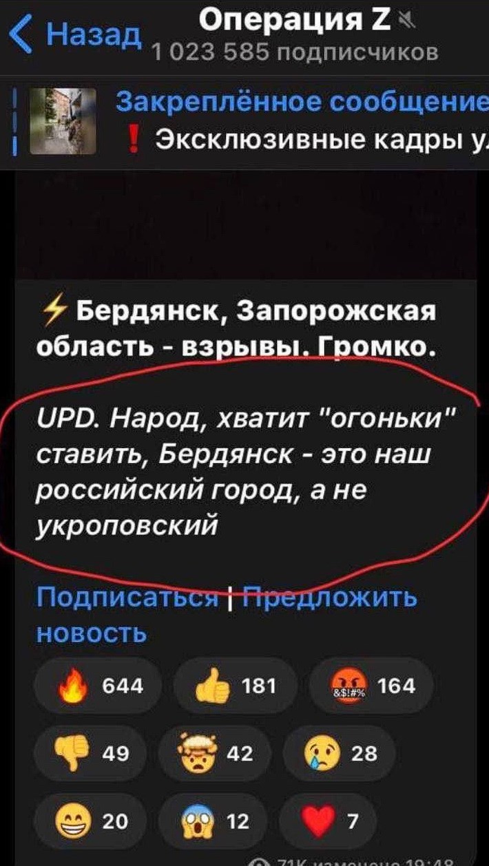 - Бердянські колаборанти засмучені, що жителі українського Бердянська радіють обстрілу окупантів на тимчасово захопленій території