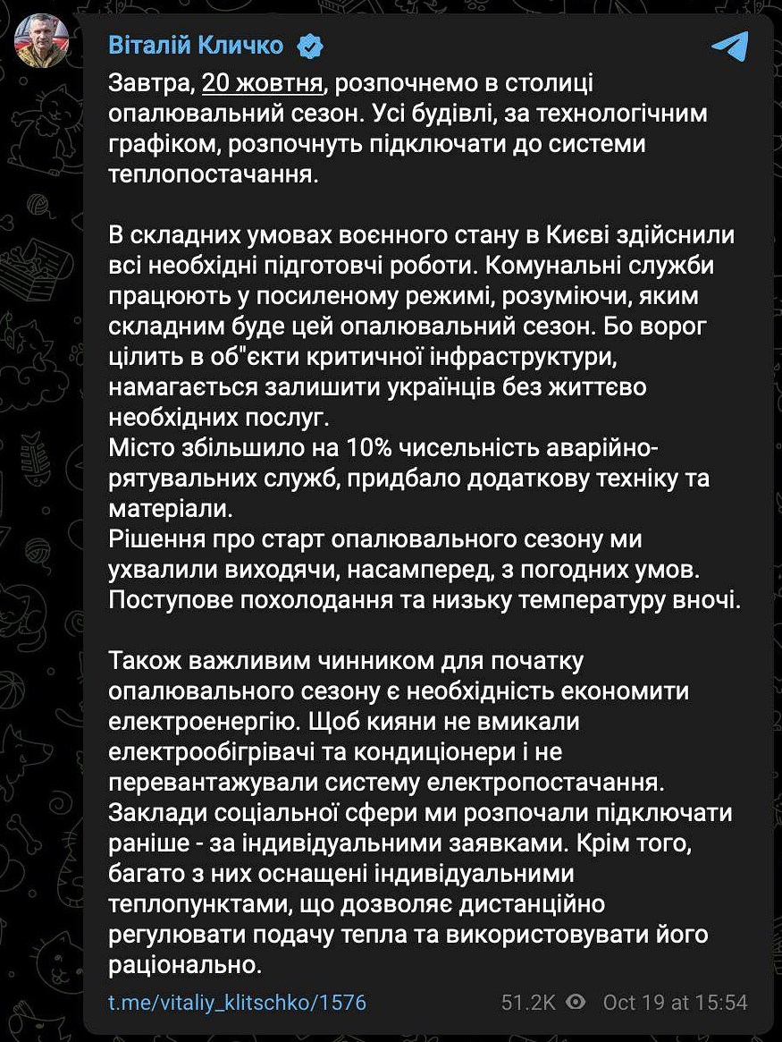 - Незважаючи на ситуацію в країні, опалювальному сезону у столиці – бути. Він розпочнеться із завтрашнього дня у столиці.