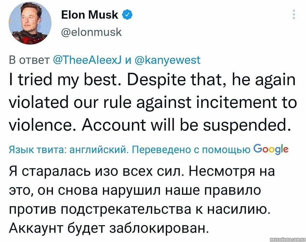 - Після хвилі зашкварних виразів Каньє Веста Маск знову забанив його Твіттер.