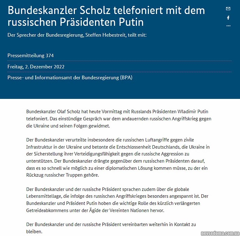 Також він засудив російські авіаудари щодо цивільної інфраструктури в Україні та "підкреслив рішучість Німеччини підтримати Україну у забезпеченні її обороноздатності від російської агресії".