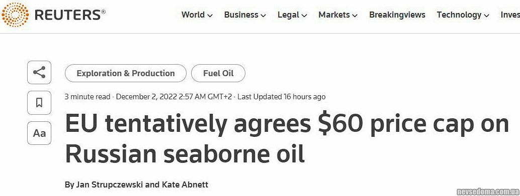 - У ЄС дійшли компромісу про запровадження стелі цін на російську нафту в 60 доларів за барель, — Reuters (https://www.reuters.com/business/energy/eu-agrees-60-barrel-price-cap-russian-seaborne-oil-eu-diplomat-2022-12-01/).