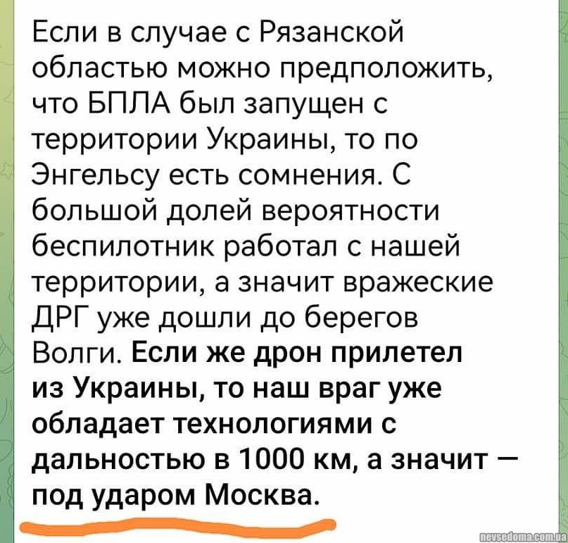 Отже, починаються удари по стратегічним базам, розташованим за сотні кілометрів від лінії фронту. Але давайте подумаємо, як безпілотники не помітили в повітряному просторі Росії і вони пролетіли в першому випадку понад 500 км (від кордону), у другому - близько 700. А це означає, що Путін почав втілювати свій план "вдарити своїми територіями і звинуватити українців .