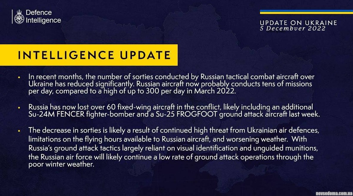 - Авіація Росії виконує в рази менше місій в Україні, ніж раніше, повідомляє Британська розвідка. Зараз це десятки на день порівняно з показником близько 300 на день у березні 2022 року. Зменшення кількості вильотів російської авіації є наслідком постійної високої загрози з боку української ППО, обмеження годин польоту російських літаків та погіршення погодних умов.