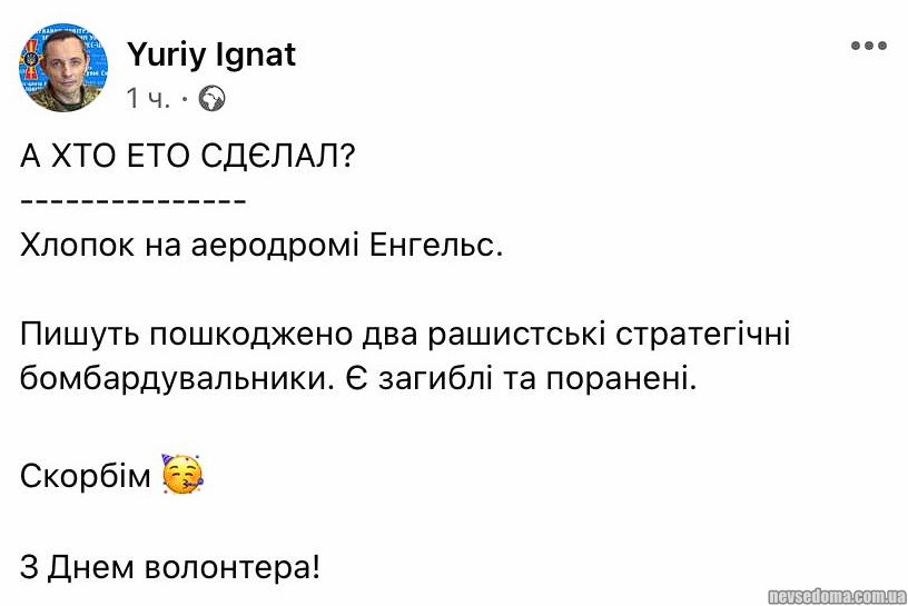 - Спікер Повітряних сил ЗСУ прокоментував вибух на аеродромі Енгельс