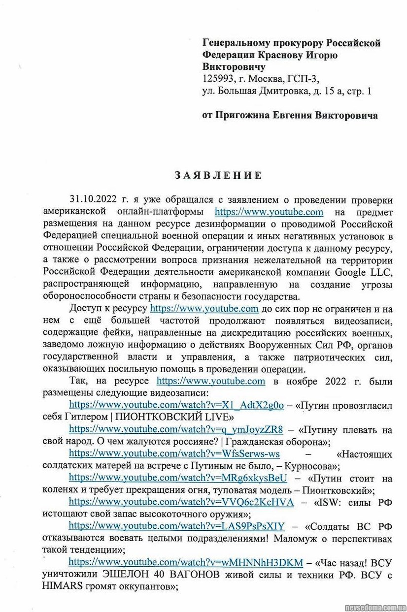 - Голова ПВК Вагнера Євген Пригожин звернувся до Генпрокурора Росії з вимогою провести перевірку діяльності Youtube. Також він має намір розглянути питання про визнання небажаної діяльності компанії Google.