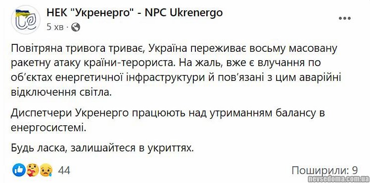 - «Укренерго» повідомляє про влучення по об'єктах енергетичної інфраструктури.