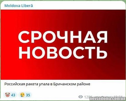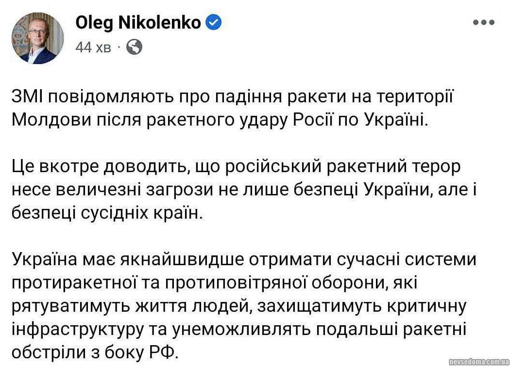- У МЗС відреагували на падіння русявої ракети на території Молдови. Як зазначив речник міністерства Олег Ніколенко, це ще раз доводить, що російський терор несе небезпеку не лише для України, а й для інших країн.