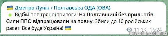 - Над Полтавщиною збили 10 ракет, повідомив голова ОВД.