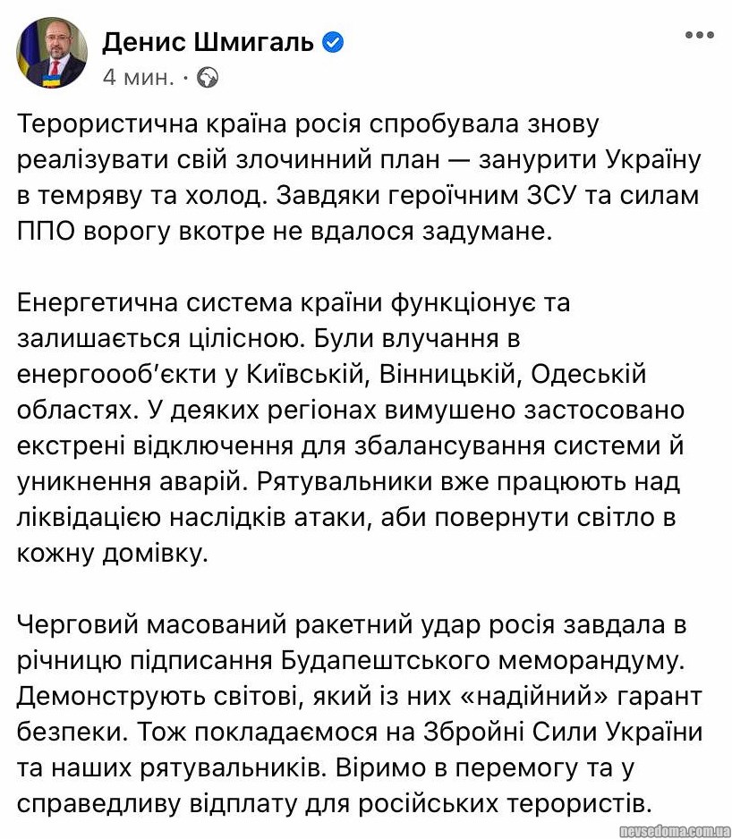 - Енергетична система країни працює і залишається цілісною. Були потрапляння до енергооб'єктів у Київській, Вінницькій, Одеській областях, повідомляє Денис Шмігаль.
