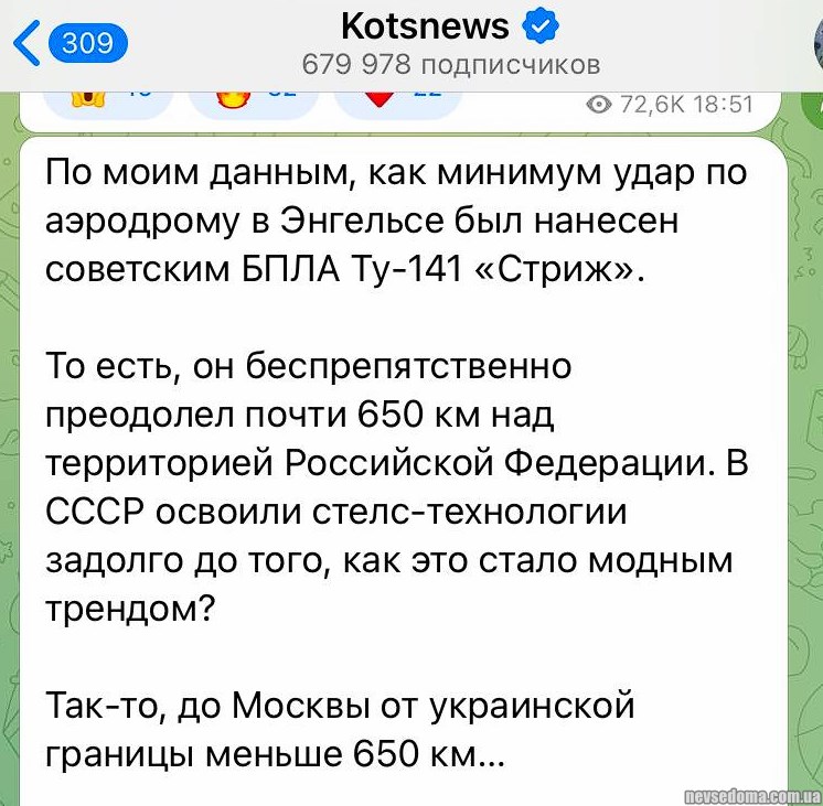- Русняві воїнкори пишуть, що сьогоднішній удар по аеродрому Енгельс був завданий радянським БПЛА Ту-141 "Стриж", який безперешкодно подолав майже 650 км над територією Росії.