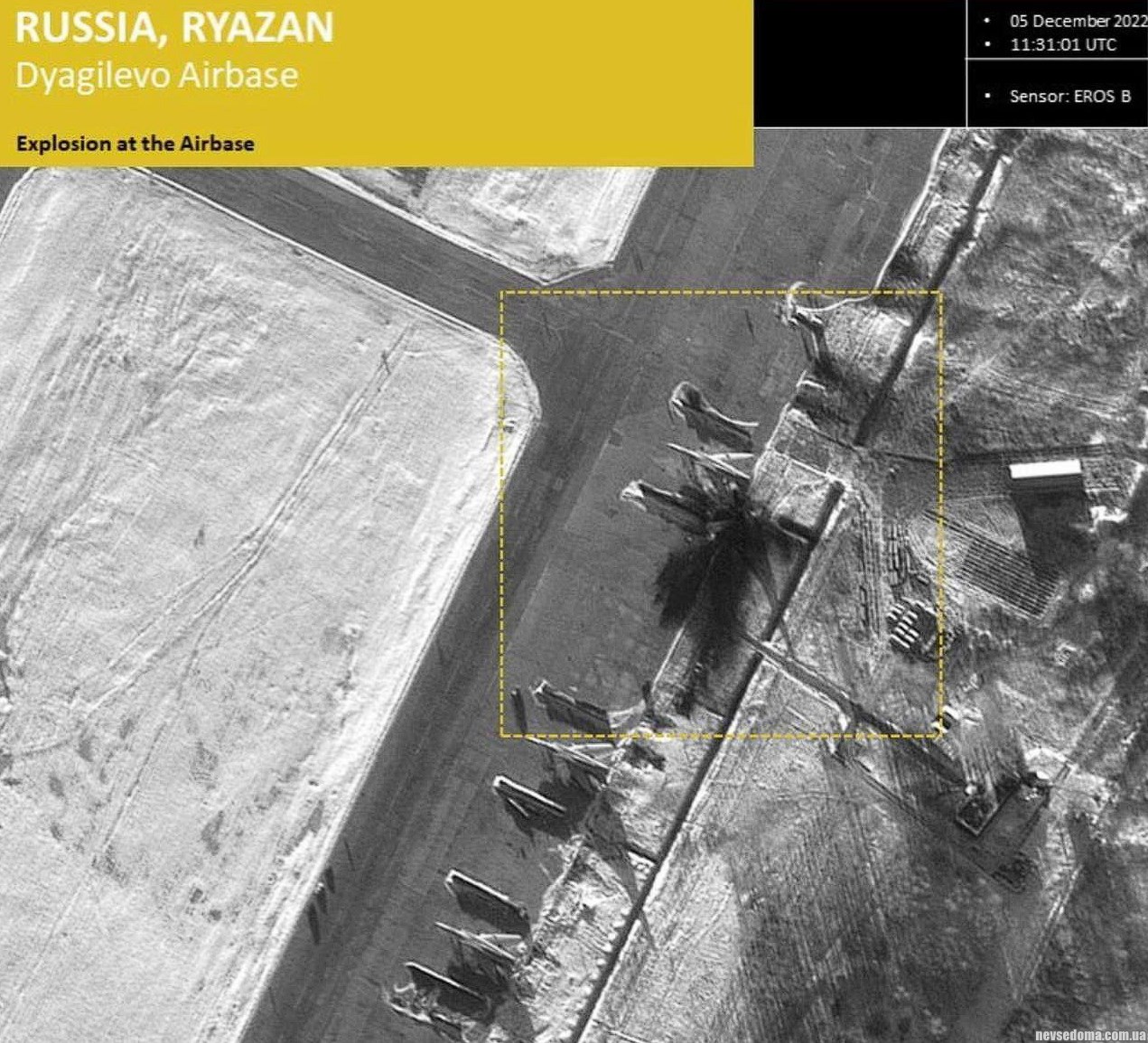 На авіабазі в Енгельсі Саратовської області дрон був запущений на злітну смугу, пошкодивши два бомбардувальники-ракетоносці Ту-95. До речі, там можуть зберігатися ядерні боєголовки. У районі авіабази Дягілєво Рязанської області вибухнув бензовоз. Троє людей загинули. Там також базуються літаки Ту-95.