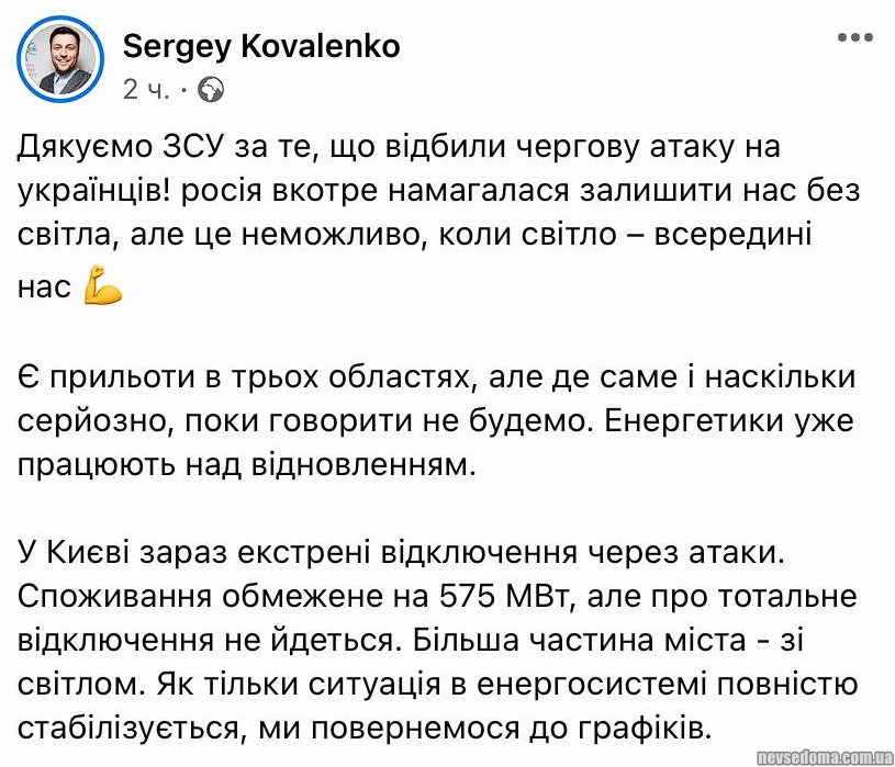 - І до добрих новин: у Києві тотального відключення електроенергії не буде, заявляє гендиректор Yasno Сергій Коваленко. Щойно ситуація стабілізується, всі повернуться до графіків відключення світла.